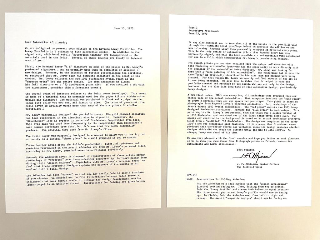 The portfolio contains: 4 lithographs, each 17” x 22”. A dark red front left 3/4 view, of a 1963 Studebaker Avanti. One Front Left 3/4 view of a red 1953 Studebaker with a left side view of...