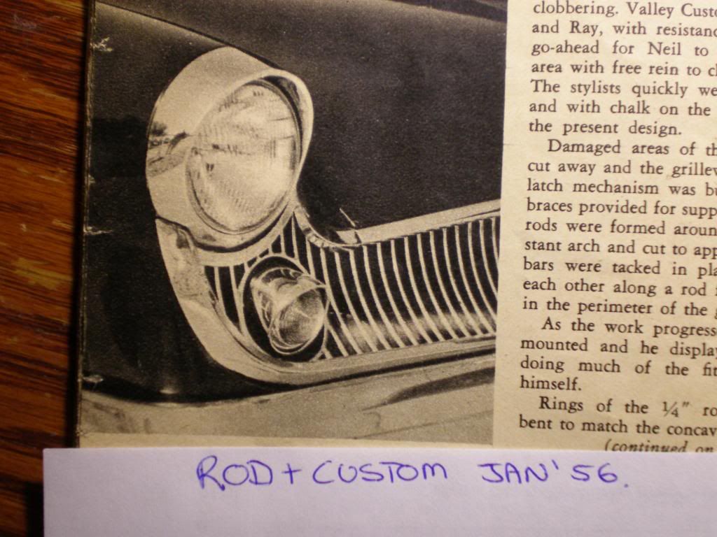 Another 53 custom. According to the article, the grill was totally fabricated from steel bar stock. The doors have electric solenoids to replace the door handles...pretty hightech for the day. The car's original front end was in an accident, hence the custom reconstruction. Looks like superb workmanship, but still wonder why bother...the 53 Studebaker grill looks like it was a custom job right out of the factory, and it's a pretty tough job to improve it beyond removing the script. Kinda looks like some 'code N' jumped on a 53 at the factory. Thought maybe Stude backup lights were used as signal lights but the text said they're Chevy park lights. Junior