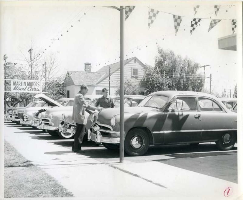 From near to far: 1950 Ford, 1952 Studebaker Starliner, 1951 Chevrolet, 1951 or 1952 Dodge (not a hemi under that open hood; no V8s until 1953), 1948 Pontiac, 1952 or 53 Willys Aero Lark (no stainless-steel around windshield opening), 1949-1951 Chevrolet, 1950(?) Buick.