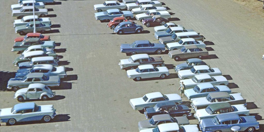 Is this the same parking lot as the previous picture? Besides a high number of VWs, there appears to be the same Buick and Cadillac that I commented on in the previous picture. I wonder what part of the country this was.