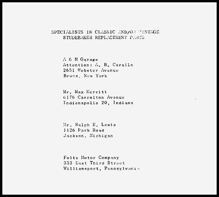 Well, Dick; that list is not entirely a wash: As you know, Max Merritt is still in business in Franklin IN, south of Indianapolis...only he sells Packard parts, not Studebaker.