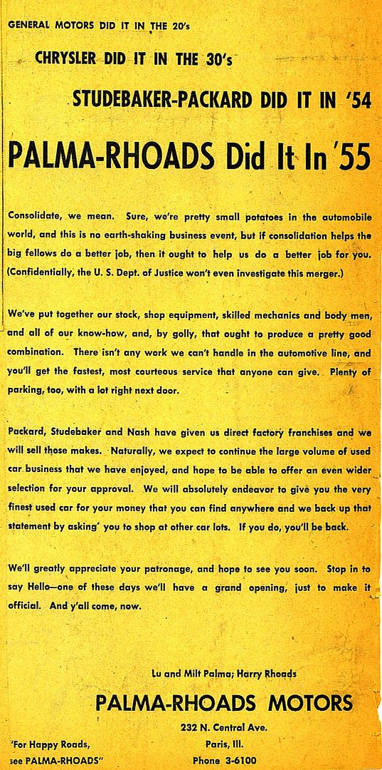 37 Days later (August 1, 1956), Packard's successful little dealership in Paris IL would hold an auction to dispose of its meager assets before leaving the property to the Studebaker dealer with whom they had shared it: