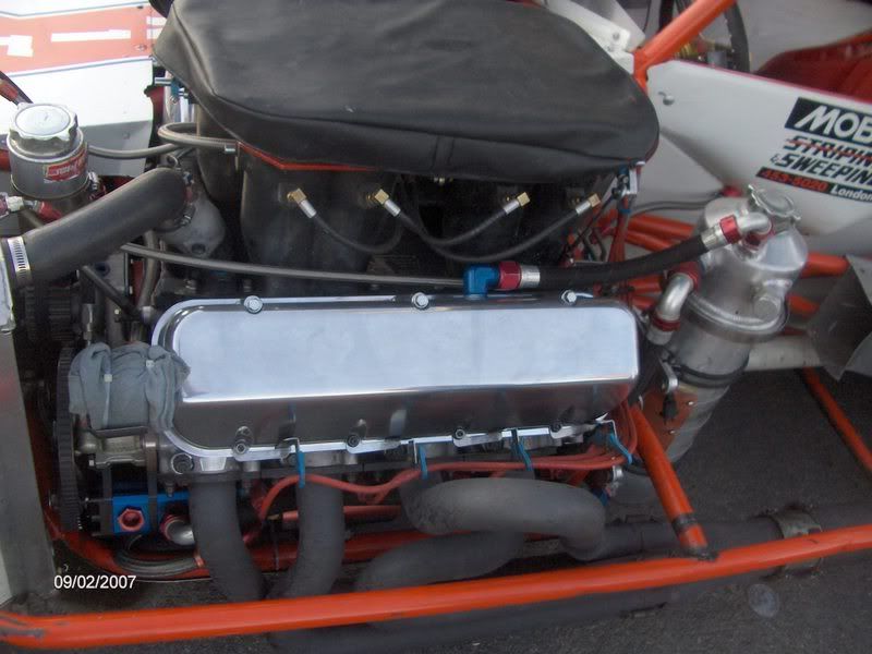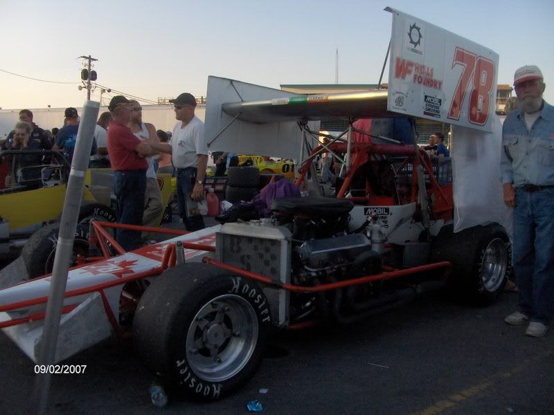 Chevy, 467 cu. in., aluminum heads, Kinsler F.I. on alcohol. direct-drive with in/out box. With wing (5/8 mile oval)- 15-16 second laps, approx. 135MPH average, approx. 155 top speed[