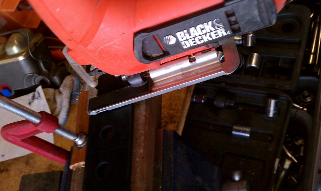 Used spade drill with outside cutting points in drill press and fine tooth metal blade in jig saw.
