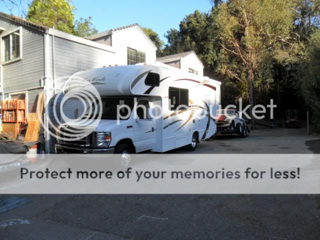 Yesterday I had a chance to try out our mew motor home on a short 3 hour round trip to Modesto, Ca. to pick up a car I found, I have a 2008 Dodge hemi powered truck I use most of the time now and also still have my 2001 chevy truck for hauling but yesterday I wanted to try out the new rig. as you can see in the pictures I got a Studebaker it is a 55 commander 2 door hardtop with a 53-54 front clip. this car has been sitting in a back yard for some time but body wise it is rather nice with only rust in the passenger side floor and even that in not really bad by Midwest standards but for some California people might think it to be really bad, these pictures are as it sits on the trailer today but after getting it off and cleaned up some I will post more pictures. being a commander it is a V-8 car and it was a 3 speed car, the engine and trans I got with it is a 60 259 and a speed both were out of the car. owner said the engine just froze up one day while driving , sound like a spun bearing, also the rear window got broke while sitting in the yard but no problem as I have a few in the shop in fact I have most every thing needed to get this going again. The car is for sale as it sits and will be even after I put more thing together for it. Interested anyone ???