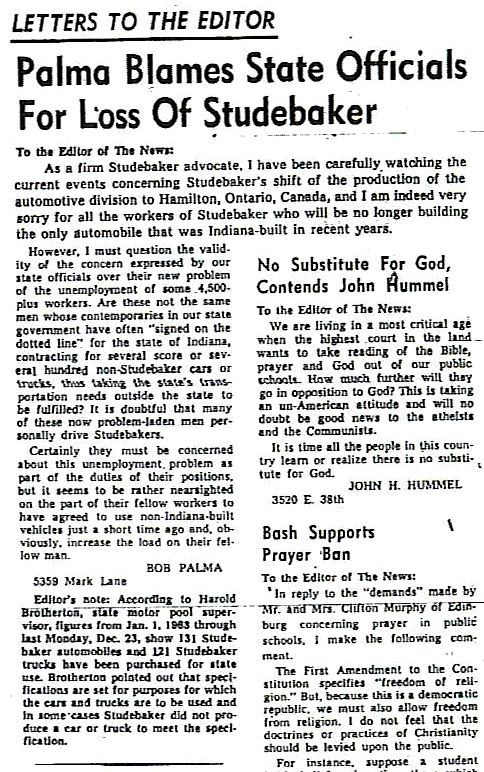 1. You have no control over the heading that will be assigned to your letter by the newspaper's editors. In this case, as can be seen, I did not blame "state officials" for the loss of Studebaker, as the editor's heading claims. Rather, I said Indiana should have been making more of a concerted effort to buy and use Studebaker vehicles, since they were manufactured here.