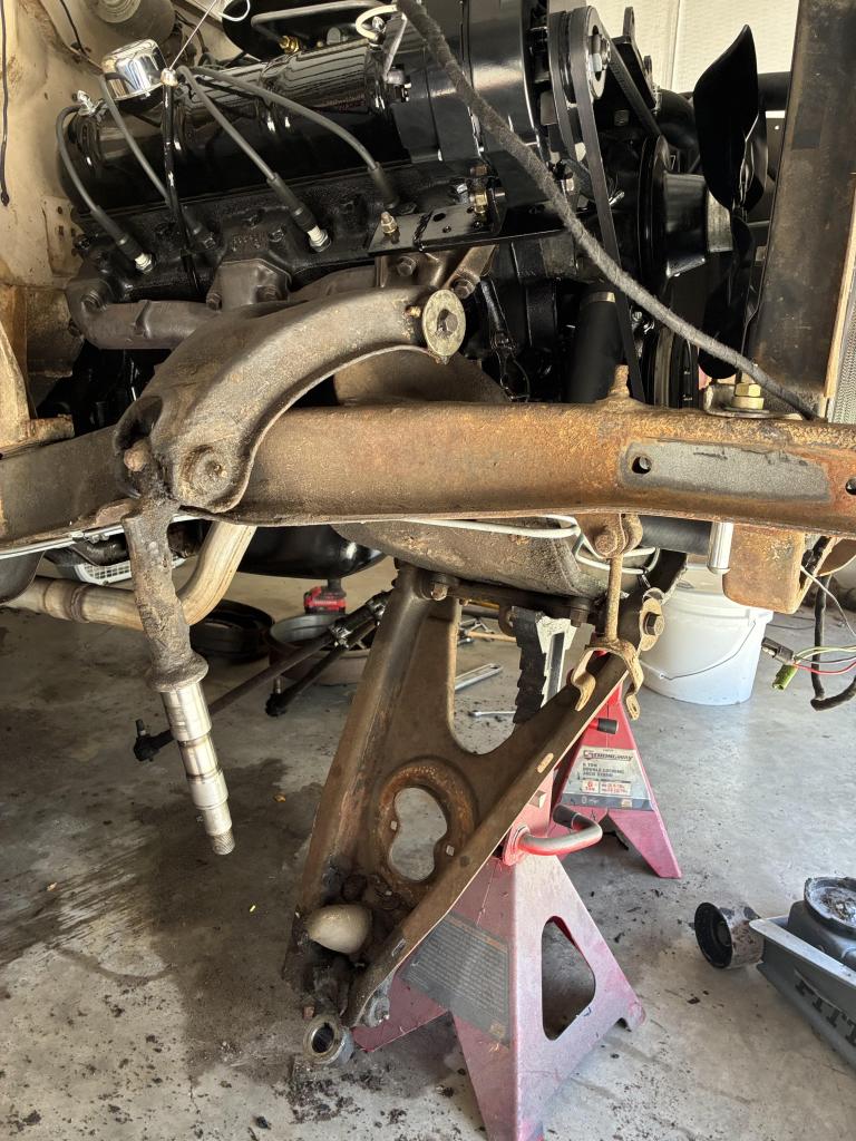 Today's fun: Pulled apart the front suspension. Years ago, George installed Delrin inner control arm bushings, but for some reason didn't replace anything else. The tie rod ends, center bellcrank pivot, king pins, and outer control arm bushings are all trashed.